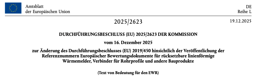 Mit dem Durchführungsbeschluss (EU) 2025/2623 der Kommission vom 16. Dezember 2025 zur Änderung des Durchführungsbeschlusses (EU) 2019/450 hinsichtlich der Veröffentlichung der Referenznummern Europäischer Bewertungsdokumente für rücksetzbare linienförmige Wärmemelder, Verbinder für Rohrprofile und andere Bauproduktewurden von der Organisation Technischer Bewertungsstellen, nachdem Hersteller Europäische Technische Bewertungen beantragt hatten, neun Europäische Bewertungsdokumente (EAD) angenommen.
