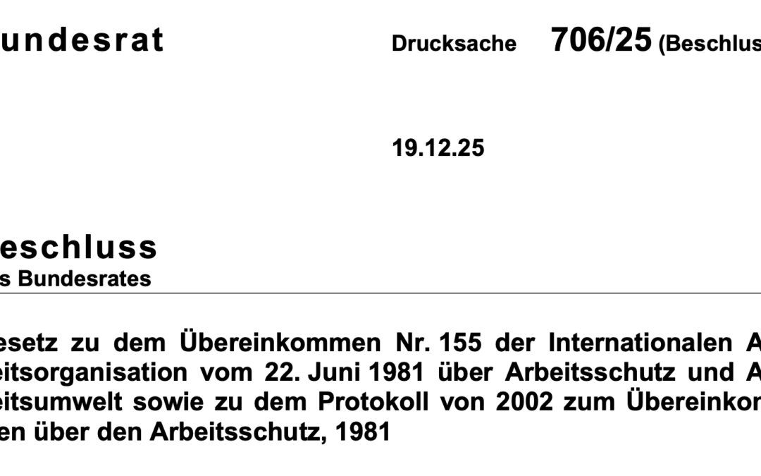 Der Bundesrat hat am 19. Dezember 2025 dem Gesetz zur Ratifikation des Übereinkommens Nr. 155 der Internationalen Arbeitsorganisation (ILO) über Arbeitsschutz und Arbeitsumwelt und des dazugehörigen Protokolls von 2002 zugestimmt (s. Beschluss). Der Bundestag hatte den Gesetzentwurf in 2. und 3. Lesung in der vom Bundeskabinett eingebrachten Fassung am 6. November 2025 verabschiedet (s. Beschlussempfehlung und Bericht).